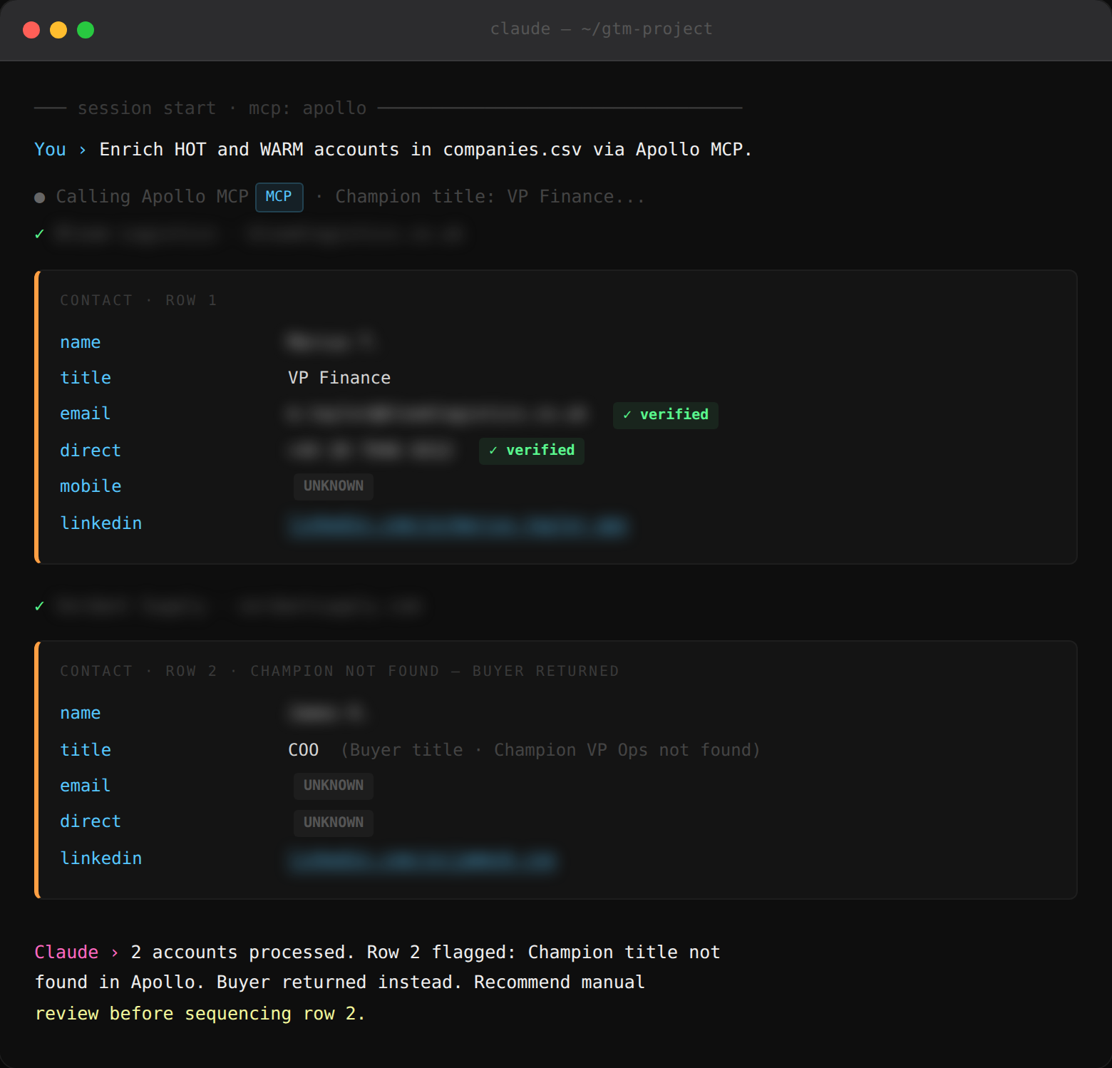 Requires: a scored account list and lead enrichment tool connected as an MCP server in your Claude Code session.