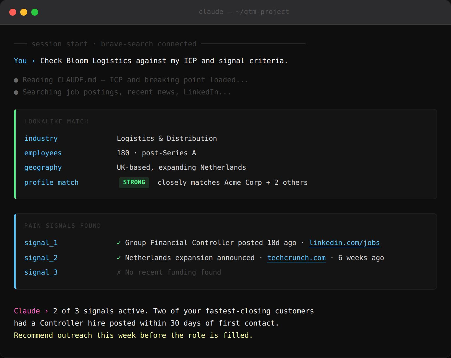 The goal is to find companies in the same situation those customers were in when they first bought, and then confirm the timing is right by checking for active pain signals right now.