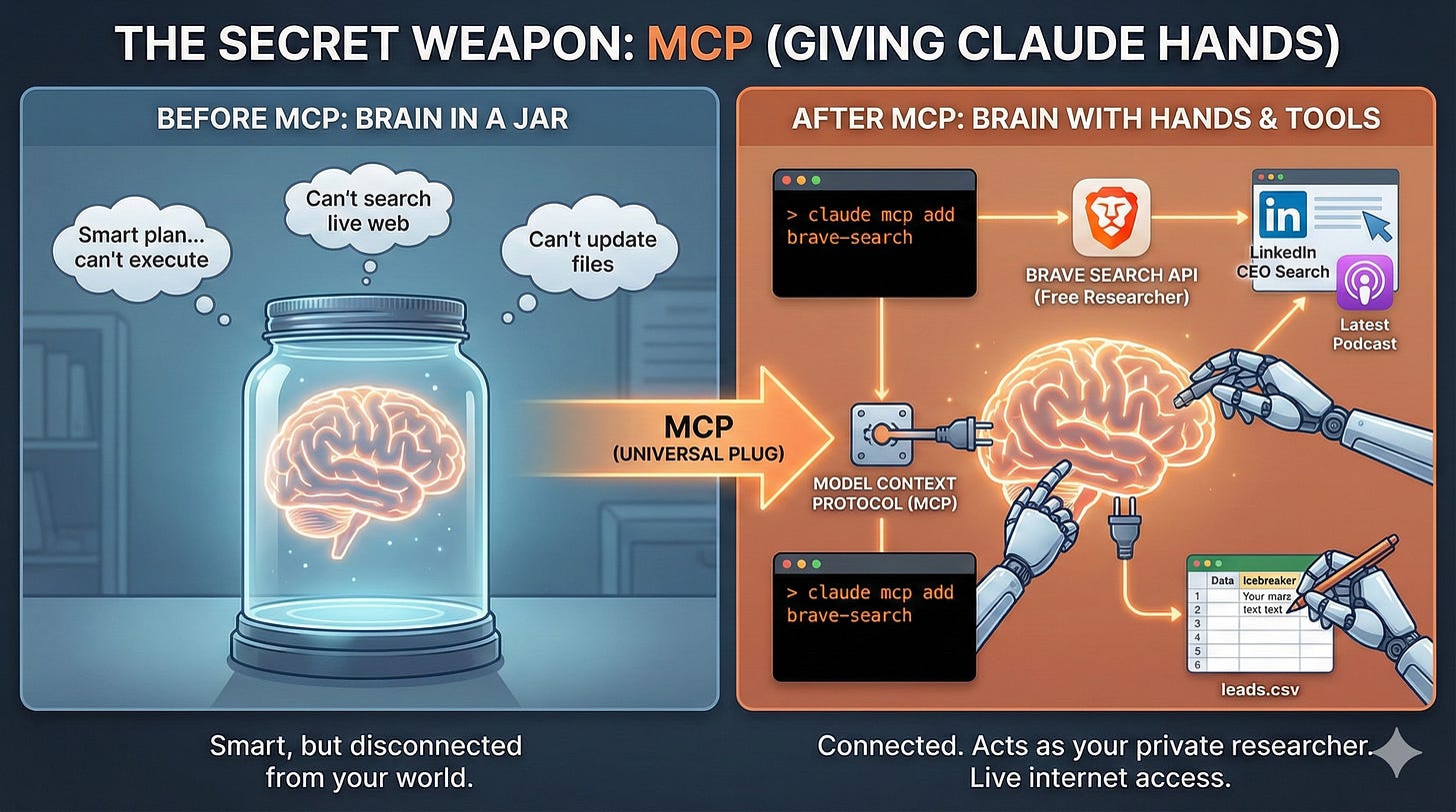 CLAUDE.md:The 50-line âConstitutionâ that forces Claude to adopt your voice, ignore âAgencyâ leads, and think like a senior partner.2: The Hands Setup (MCP): A 2-minute guide to installing Brave Search so your agent can browse the live web (LinkedIn, Crunchbase, News).