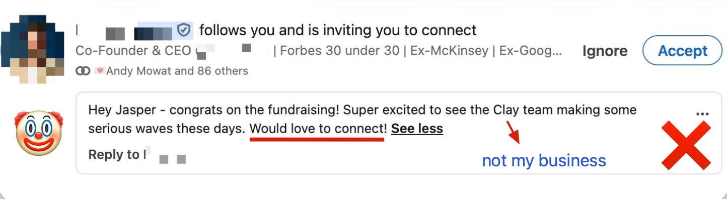 Every person writing “Saw you liked…” or “We’re both in…” is broadcasting the same subtext: I’m about to sell you something.