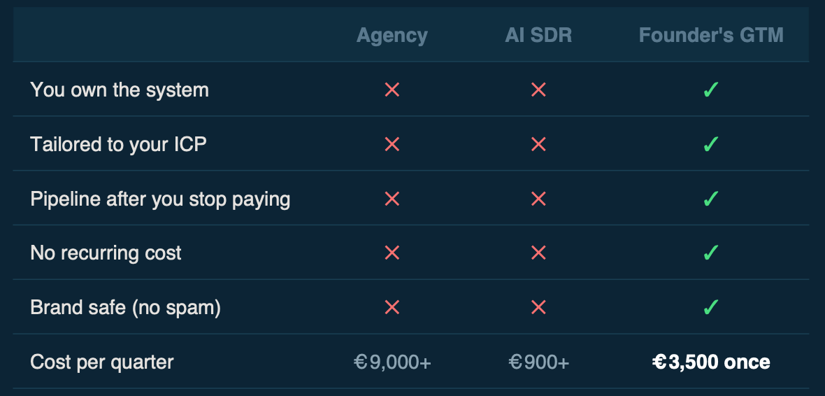 Three things. We build systems, not templates. I use Claude Code as a core part of the stack, which many teams have not touched yet. And I cap my client load at 5 per quarter so I go deep with every founder. Plus the guarantee: if it does not produce results, I keep working until it does.