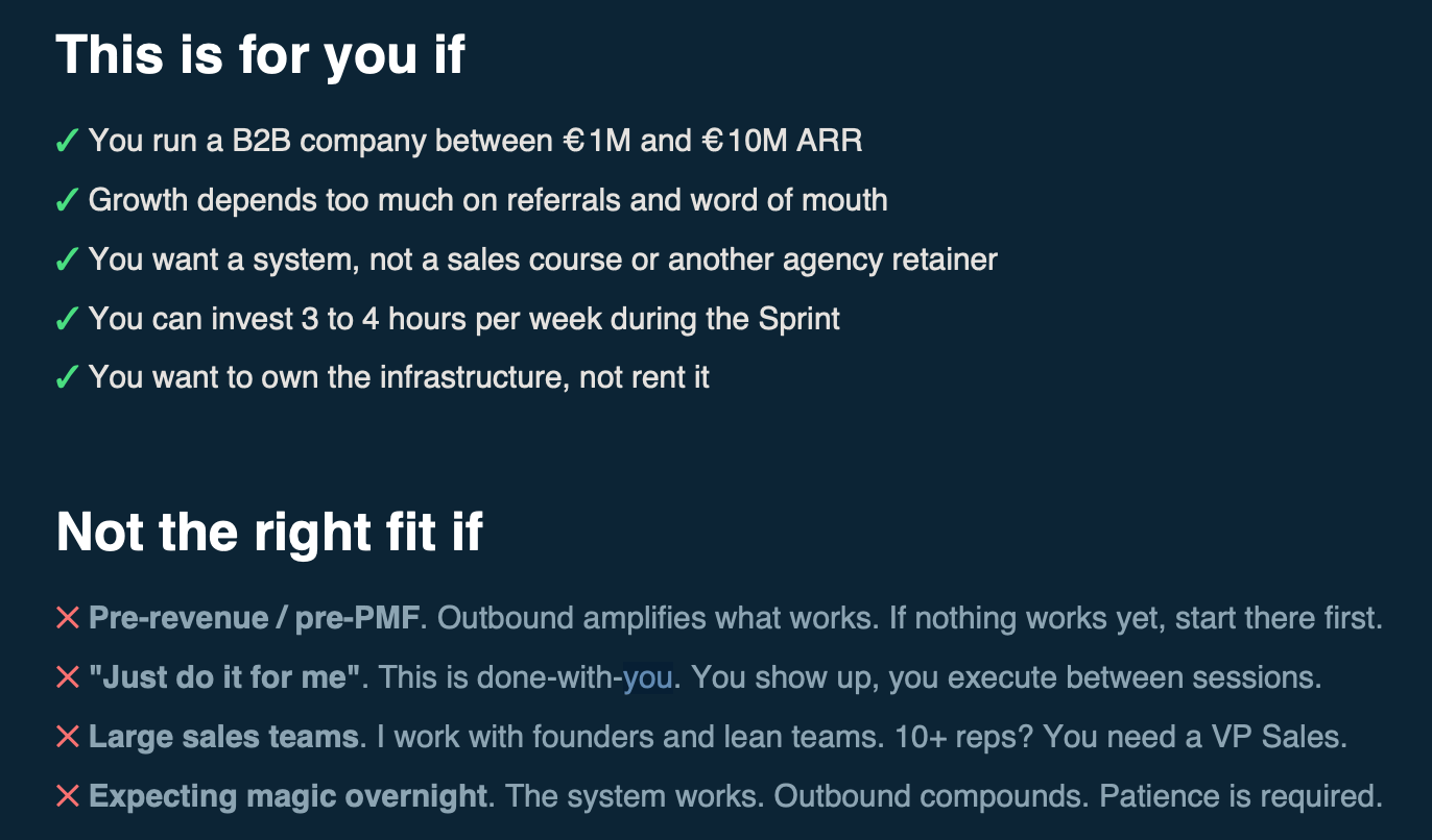 If you have paying customers and a clear buyer, outbound works. The question is always targeting and messaging, never the channel itself. That is exactly what the Sprint addresses. And the guarantee protects you: if your first campaign gets zero qualified replies, We keep working until it does.